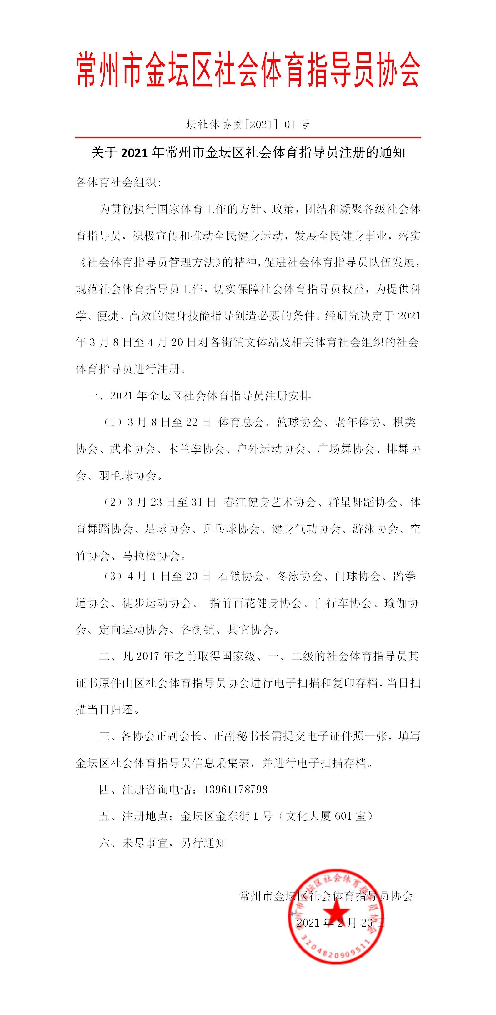 关于2021年常州市金坛区社会体育指导员注册的通知